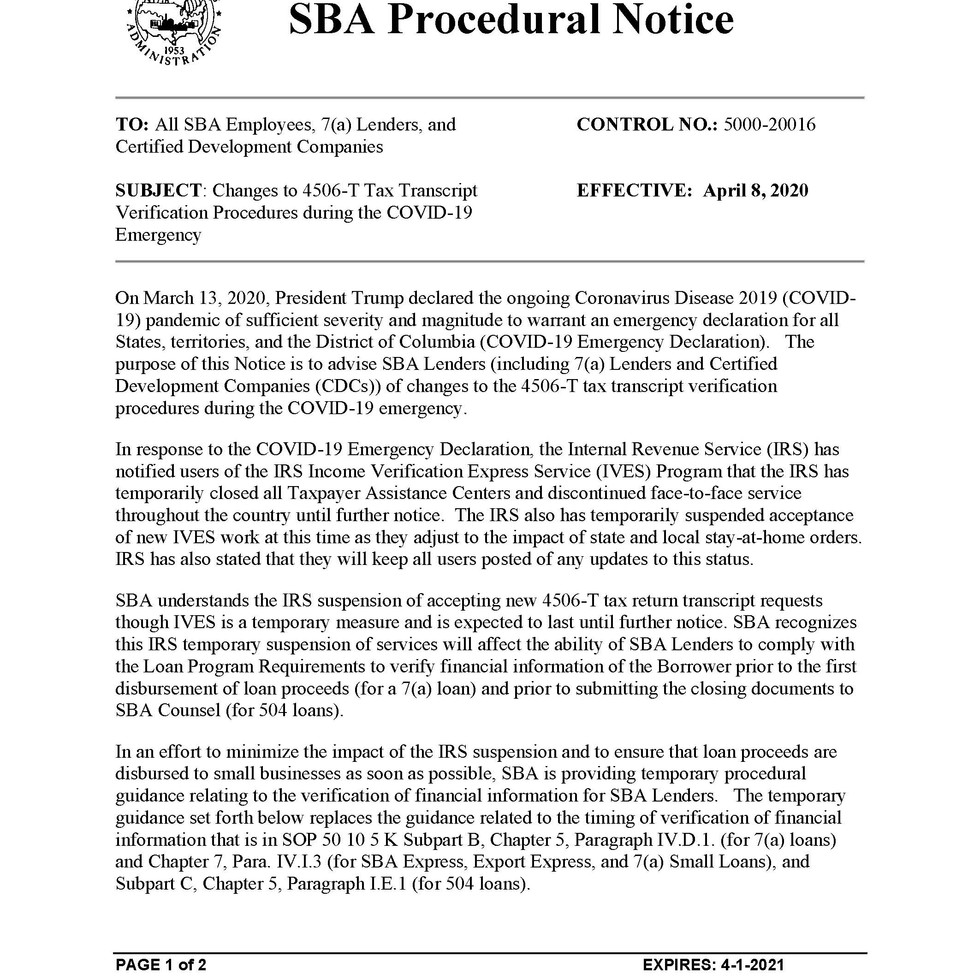 SBA Procedural NoticeUT Permian Basin SBDCApr 9, 20201 min readPlease read the changes to the 4506-T Tax Transcript Verification Procedure due to covid-19.
